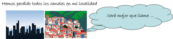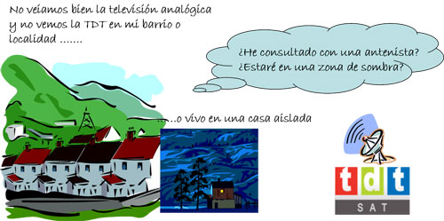 Si en su barrio o en su localidad nunca se ha visto la televisión analógica o se ha visto de forma muy deficiente probablemente se encuentre en una zona de sombra de cobertura donde no llega la señal de TDT. En estos casos está prevista una solución mediante un sistema de satélite, con el que podrá acceder igualmente a todos los canales gratuitos de televisión digital de ámbito nacional. Una vez que un instalador registrado haya podido determinar cuál es la solución tecnológica que se adapta mejor a la situación particular de su vivienda, podrá ponerse en contacto con un distribuidor autorizado por los fabricantes de receptores SAT-TDT de su provincia para solicitar el equipo necesario. Para saber si existe algún tipo de financiación para la compra del kit satelital debe preguntar en su Comunidad Autónoma.