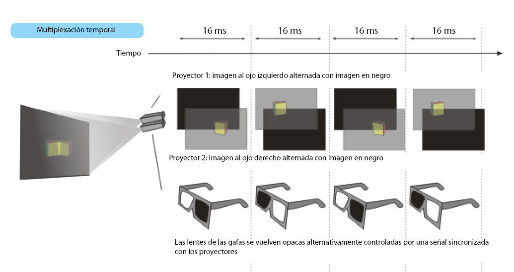 El método de multiplexación temporal consiste en representar alternativamente una imagen completa perteneciente a cada ojo en cada fotograma o frame de la imagen. Mediante unas gafas LCD de obturación,correctamente sincronizadas, se consigue que cada ojo vea solo el frame que le corresponde.